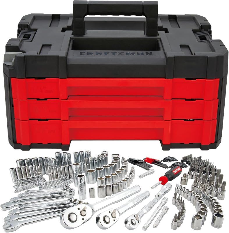 ・この262点ツールセットには、自動車愛好家、整備士向けの全てのソケット、ラチェット、レンチ、特殊ビットが含まれており、全てが高耐久性3段引き出し式ツールボックスに収納されています