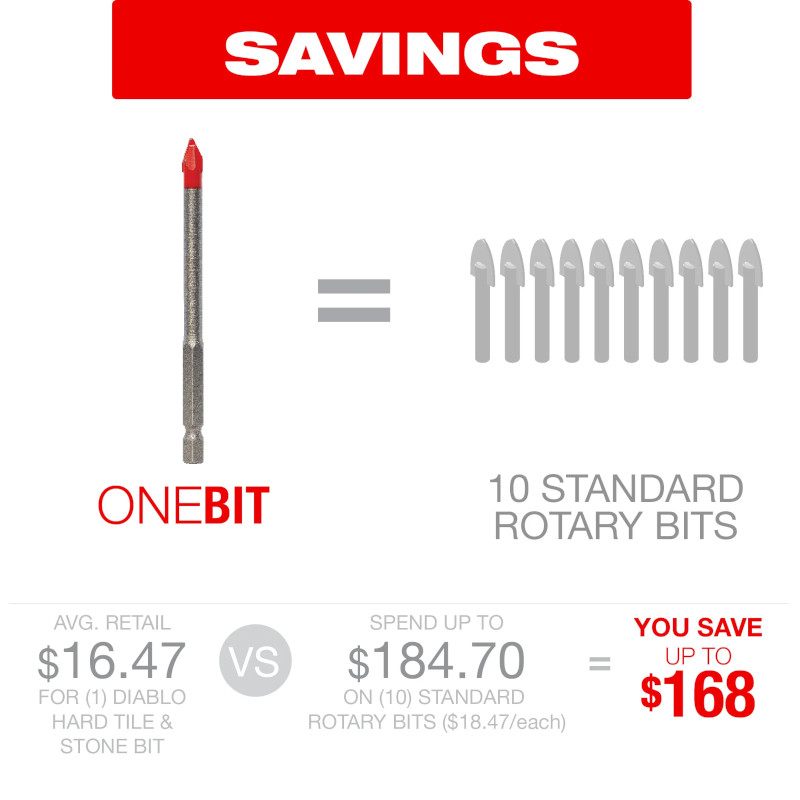・Diablo製カーバイドは、耐衝撃性で、標準タイル&石材用ハンマードリルビットと比較して最大限の耐久性と優れた製品寿命を実現します