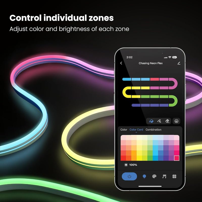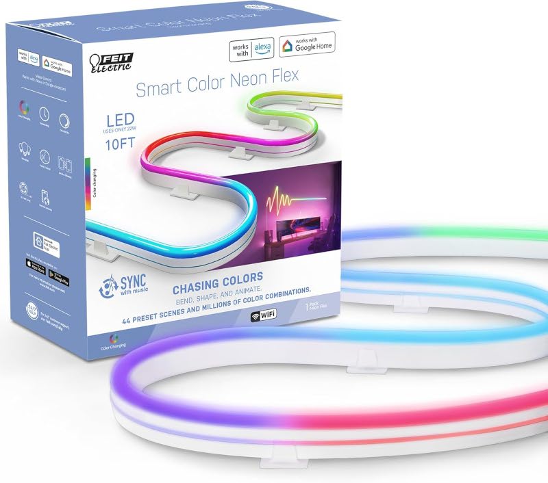 長さ10ft.(約3 m)のFeit Electricスマート対応ネオンフレックスライトは、鮮やかな色と刺激的な可能性のの世界に没頭させるためにここにあります。この柔軟な壁用ライトは、最先端のRGBIC テクノロジーを備えています。何百万もの色とコンビネーションから選択し、感覚を魅了する絶えず変わるライトショーを創り出しましょう。ゲーム、映画鑑賞の夜、パーティ、イベントなどに最適な、ネオンフレックスライトは、あらゆる場面に刺激的な雰囲気を加えます。ライトの長さに沿って色を変え、チェイス、フローイング、フェードなどのエフェクトで動きをつけましょう。ミュージックマッチ機能を使えば、お気に入りの曲に合わせて照明を同期させ、どんな部屋も躍動感あふれるダンスフロアに変えられます。リラックスムードの時も、野獣のようなムードの時も、このスマートフレックスライトは全てに対応できます。素早く雰囲気を変えたい場合は、プリセットシーンでパーティーをすぐに始められます。または、カスタムシーンを創って音声アシスタントで作動させることもできます。設置は簡単です。中硬度デザインにより簡単に壁面へ形作って設置できます。無料のFeit Electricアプリと2.4GHz Wi-Fi 接続を使用して、わずか数分でセットアップが完了します。Alexa または Google Homeアシスタントを追加すれば、音声コントロールが実現します。今までにないようなカスタマイズできるダイナミックなライトを体験しましょう。今すぐ自宅やイベントスペースをアップグレードしましょう。