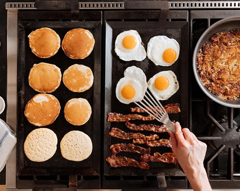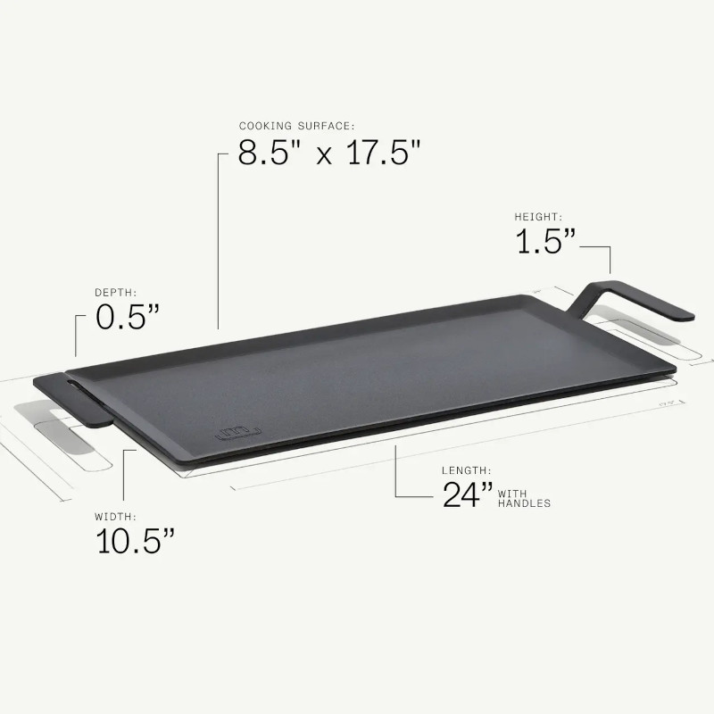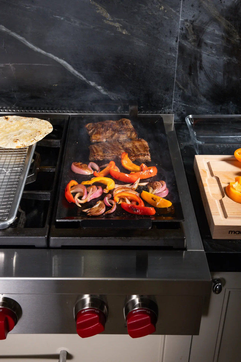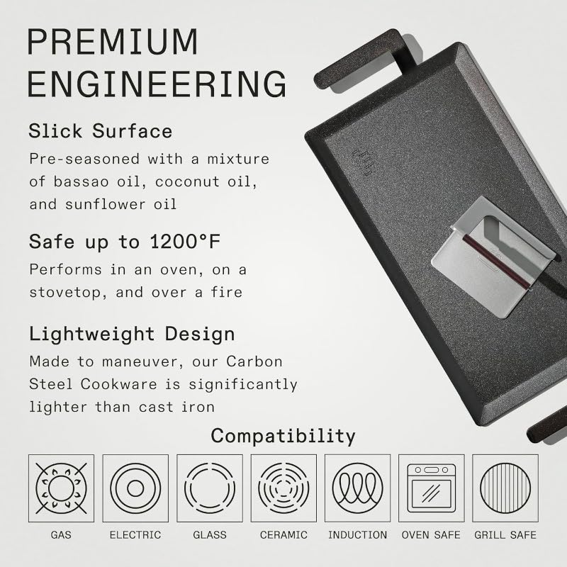 Made In Cookware のカーボンスティールは、鋳鉄の保温性とステンレスクラッドのコントロール性と操作性を兼ね備え、天然のノンスティック加工を実現しました。グリドルはあらかじめシアーナッツオイルとココナッツオイルの混合物でシーズニング加工されているので、初日からカーボンスティールの違いを体験できます。コンロからグリルまで持ち運びやすい軽量設計で、2つのバーナーにフィットし、2つのゾーンで調理を実現できます。レストランのフラットトップグリルの最高の部分を再現したカーボンスティール製グリドルは、熱接触を最大限にし、スマッシュバーガー、ふわふわのハッシュブラウン、とろけるグリルチーズの端を完璧にカリッと焼き上げられます。手作業で溶接された、持ちやすい高さのあるハンドルは、オプションでイタリア革製カバーを備え、人間工学に基づいた持ち心地を実現し、傾斜した側面により過剰な水分や油脂を吸収します。このベストセラーの形状により、お気に入りレストランの料理を自宅で楽しむことができるようになります。