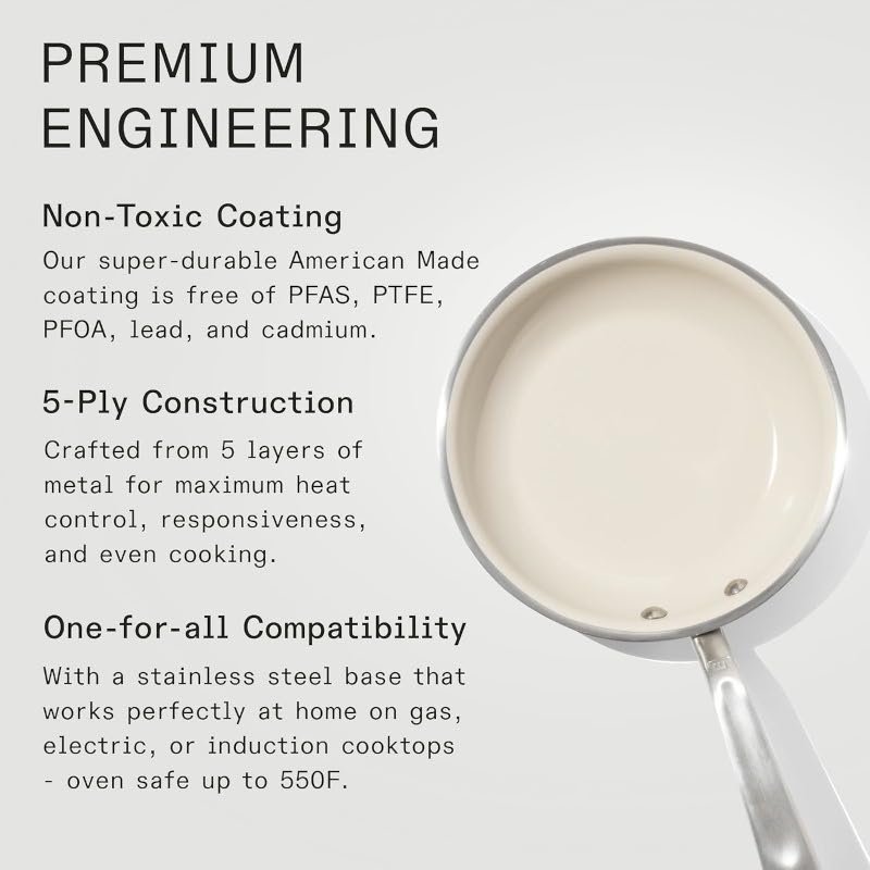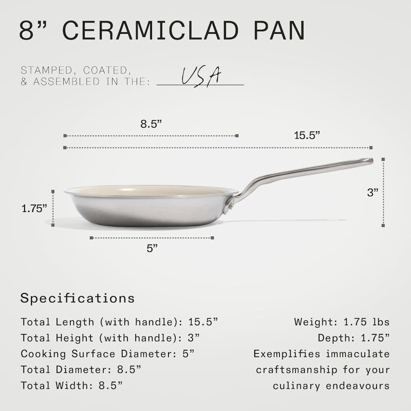 この種の製品としては初めての CeramiClad フライパンは、受賞歴のある 5 層ステンレスクラッド調理器具の均一で反応性の高い熱コントロールと、独自のノンスティックセラミックコーティングを組み合わせています。簡単に使用やお手入れできるアメリカ製セラミックコーティングは、PFAS, PFOA, PTFE、鉛、カドミウム不使用で作られ、低価格のカウンター製品よりも清潔で長持ちする定番アイテムとなります。毎日の調理用に設計された多用途なCeramiClad フライパンは、電気、ガス、IHクッキングヒーターに対応しています。頑強ながら軽量構造とカーブ状の壁を備え、野菜ソテーから皮がパリッとした焼き魚、目玉焼き、重ね焼きパンケーキなど、あらゆる料理に活躍します。安価な代替品とは異なり、最大華氏550度(摂氏287度)まで耐えられ、ハンドルは冷たさを維持できるので、コンロで調理してオーブンで仕上げる料理に最適です。