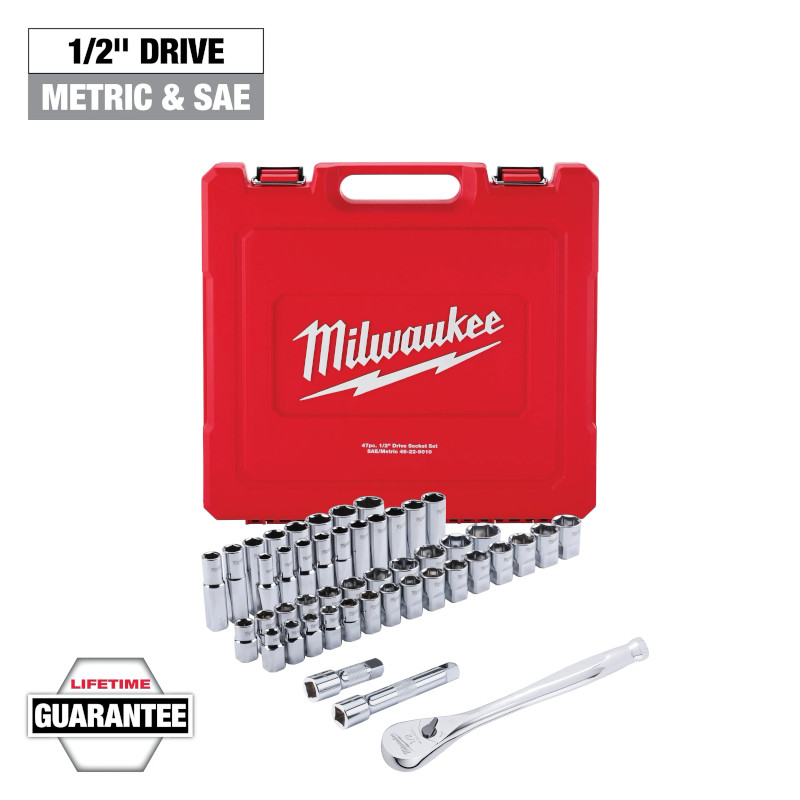 Milwaukee SAE & Metric 1/2 in.(約12.7 mm) ドライブラチェット&ソケット47点セットは、狭いスペースで優れたアクセス性を提供し、最大限のツール強度を備えています。これらのソケットセットは、革新的なレンチ対応ソケットデザインを備え、4つの平らな側面により転がりを防ぎます。1/2 in. (約12.7 mm)ドライブラチェットは、平ら部分にレーザーで刻印されたサイズ付ソケットを備え、視認性が向上します。