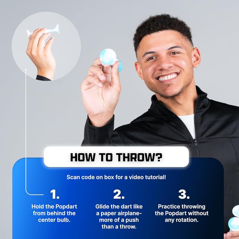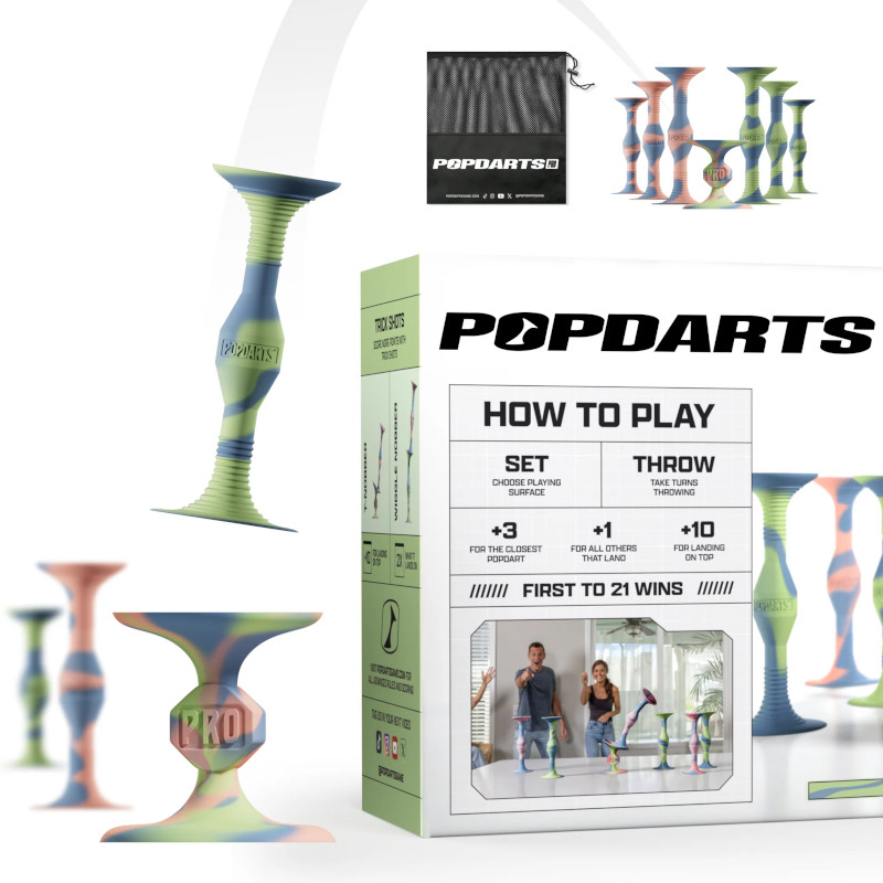 ・付属内容: (3) 1色のPopdarts (プレイヤー1)、(3)別色のPopdarts (プレイヤー 2)、(1) プロ用ターゲットマーカー、(1) キャリーバッグ(1 mmごとが重要なので、ルールと定規を搭載)、(2) 誰もがあなたがPopdarts ファミリーの一員であることが確認できるステッカー