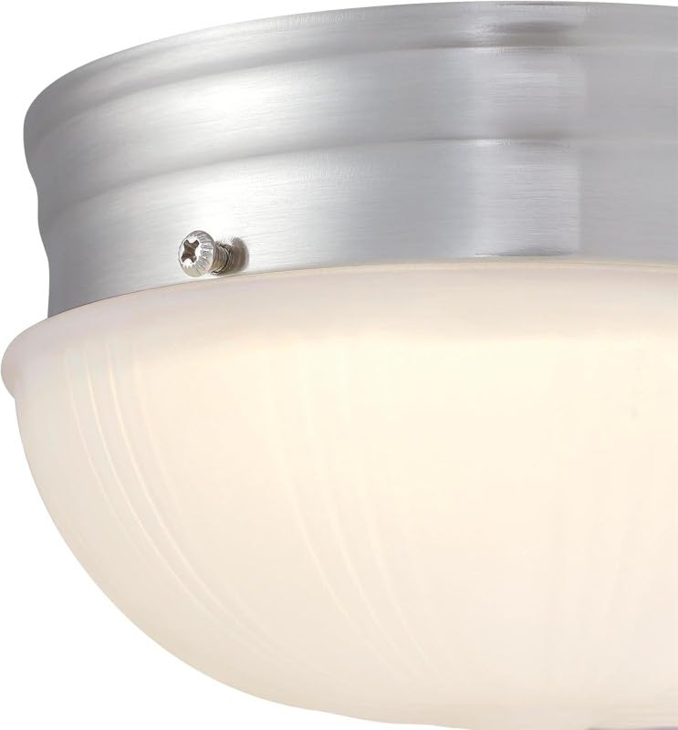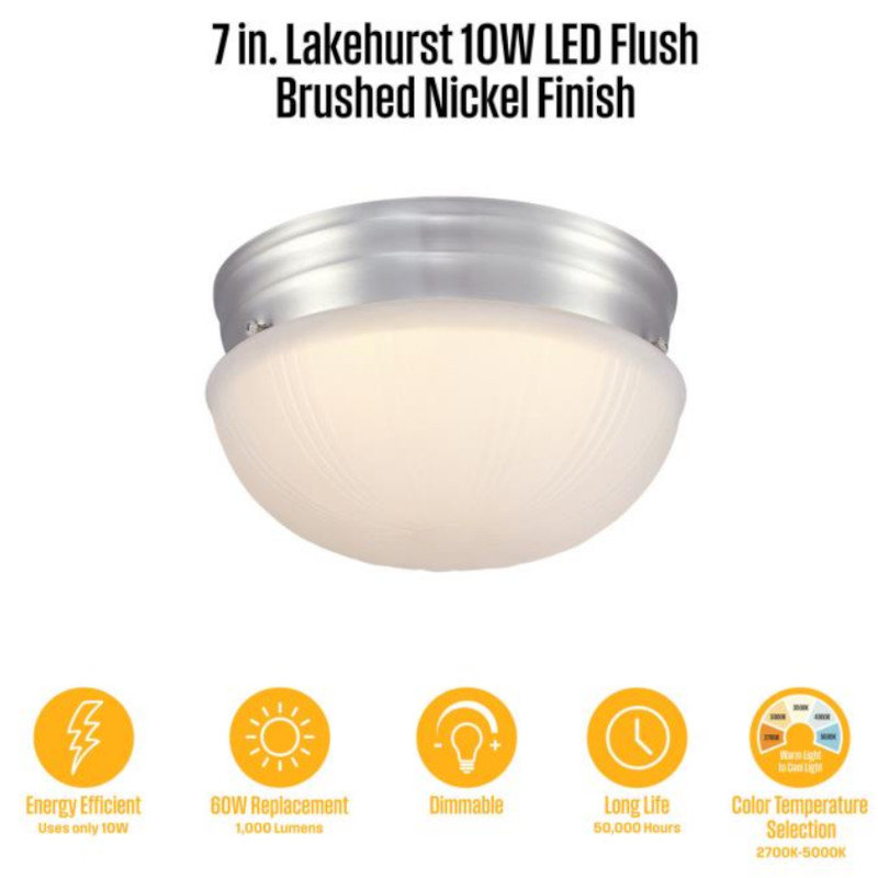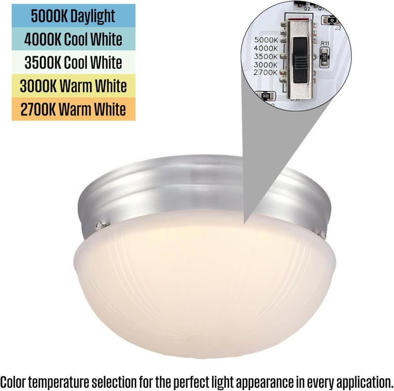 10W、7インチの調光機能付LED 直取付式シーリングライト(フロストガラス付ブラッシュニッケル仕上げ)は、自宅のあらゆる部屋に最適な洗練された現代的なソリューションとなります。この照明器具は、エネルギー効率性に優れた10 WのLEDを備え、電力消費量を軽減しながら鮮やかな照明を提供します。フロストガラスディヒューザーが光を柔らかく均一に拡散し、眩しさを抑えた快適で居心地のいい空間を演出します。2700K(暖白色)から5000K(昼光色)までの調節式色温度範囲を備え、対応調光器を使用することで気分や活動に合わせて明るさを簡単に調節できます。ブラッシュニッケル仕上げは、現代的な優雅な雰囲気を加え、薄型直取付デザインにより、寝室、廊下、キッチンなどの天井へシームレスに溶け込みます。この美しく作られた LED直取付照明器具は、スタイル、効率性、万能性を兼ね備えています。